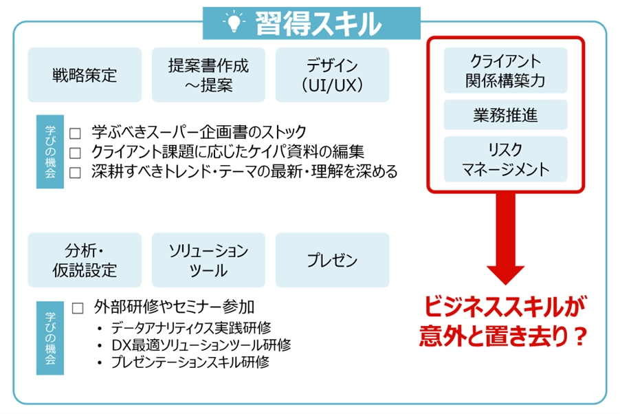 されやすいのが、置き去りになっている基礎的なビジネススキルです。しばしば、デジマ人材のスキル向上においては、データ分析、マーケティングツール知識などの専門スキル向上に偏りがちです。しかし、クライアントとの関係構築やプロジェクトの推進・マネジメント能力などのビジネススキルは、これらの土台ともなる重要なものです。ビジネススキルを身に付けるために必要な研修やセミナーは少なく、ましてやデジマ人材にマッチした研修はなかなかありません。そのため、必要なスキル習得のために外部の助けをすぐに求めることは避けるべきです。この学びの機会の書き出しでは、図2にあるような企画書のストックといった自社でできる学び方を知ることで、「まずは自社で試してみてそれでももしできなければ外部研修の導入を検討する」など、学び方の選択を段階的に考えやすくなります