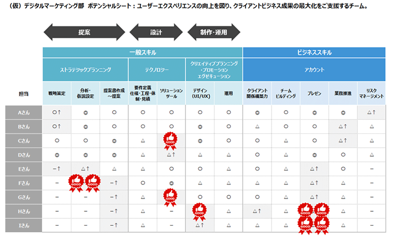 とあるデジマ支援会社では、社内のアセットを共有してスキルの習得を促したいと考えていました。そこでマネージャー職は、スキル習得への積極的な姿勢が見られたチームメンバーがいれば、星取表の該当スキルの欄に「グッジョブ」のマークをつけるようにしました。