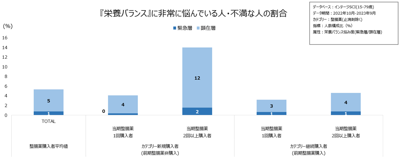 図表6でもわかる通り、今回伸長した「整腸薬を新規で購入しリピートしている人」は他の整腸薬購入者よりも“栄養バランスに不満がある”といえます。整腸薬の購入に至った行動の裏には“栄養バランスの乱れ”といった背景が隠れているのかもしれませんし、栄養バランスの乱れにより、便秘という症状が発症し、整腸薬を購入するといった購買ジャーニーも想像できます。