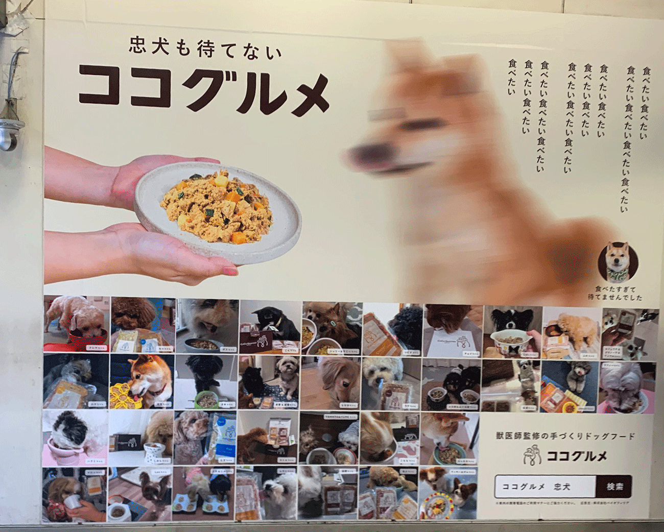 次に、2023年10月に実施されたペットフード「CoCoGourmet」のOOHを紹介します。同広告では、「忠犬も待てない」のキャッチコピーとともにブレブレな写真がファーストビューとなっており、強い印象に残るクリエイティブになっています。