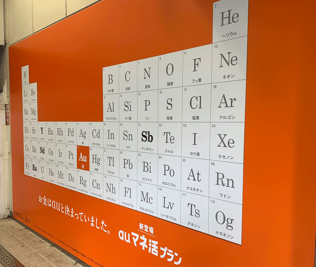 周期表の下に記載されているメッセージ、「お金はauと決まっていました。」から推察するに、太字の元素記号は同業他社である「Sb(ソフトバンク)」「Y(ワイモバイル)」「Nd(NTTドコモ)」「Ra(楽天モバイル)」を指している様子。同社のブランド名「au」が周期表上で“金”を指すことに着目した視点と、競合他社との対比を表現した発想力が際立った事例でした。