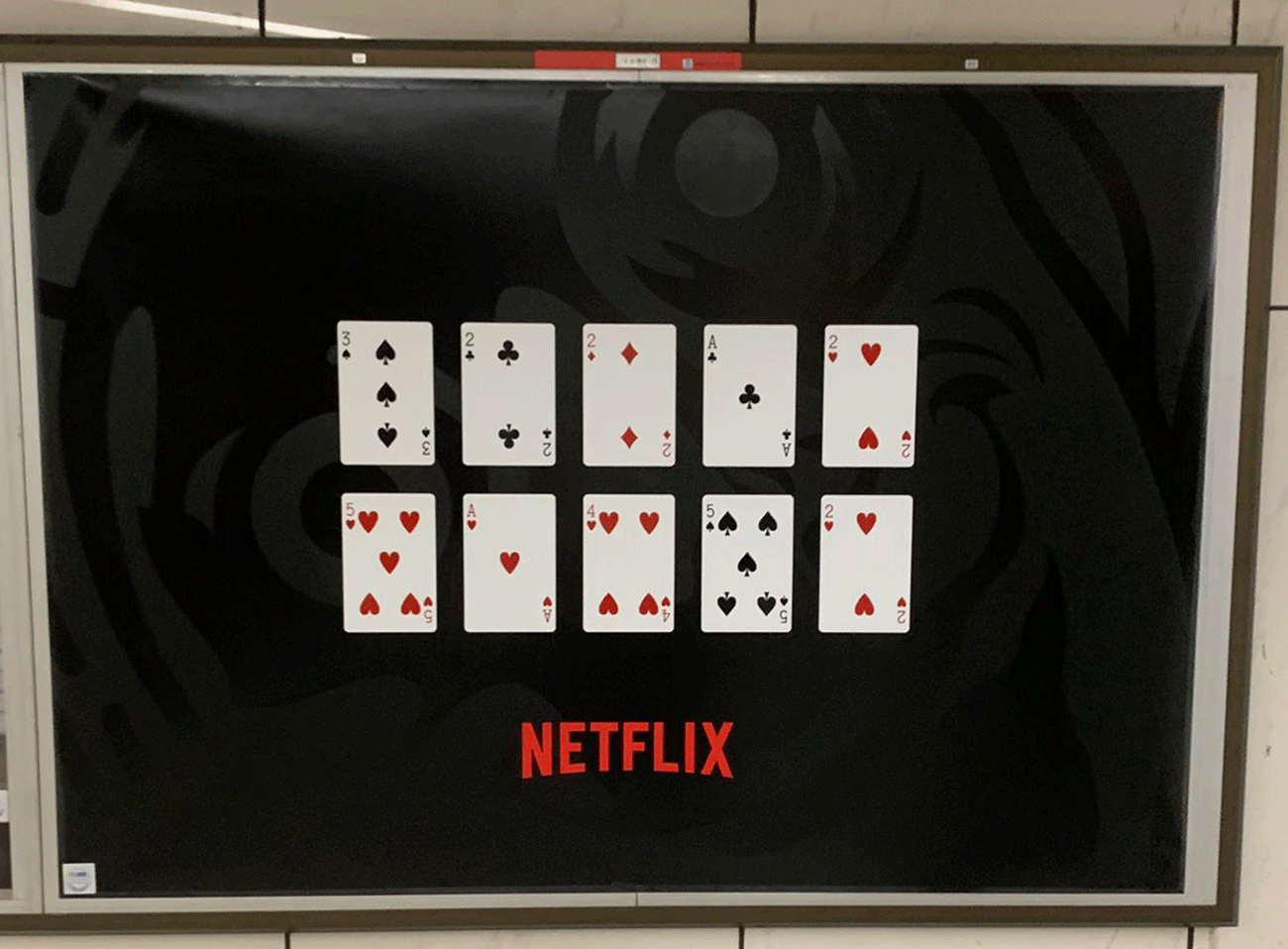 同施策では、事前情報もなく突如、NETFLIXロゴとトランプのイラストが描かれた広告を掲出。背景にはジョーカーを彷彿とさせるキャラクターが映り込んでいるだけで、文字による解説は何もありません。謎が多いこのメッセージを読み解こうとSNS上では様々な投稿が挙げられ、意図に気が付いたユーザーによる投稿も多数見られました。