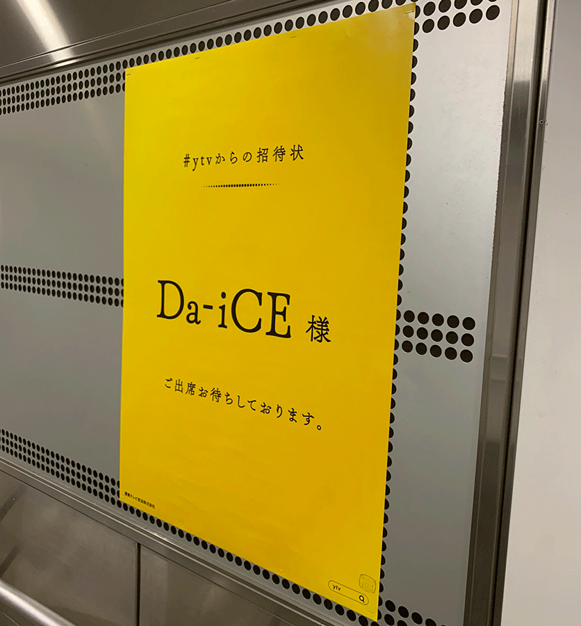 高級感のある黄色の背景に、アーティスト名と「ご出席お待ちしております。」の意味深メッセージ。「#ytvからの招待状」との記載から何かの招待状である事は推測できますが、そのイベントが何かは同クリエイティブからはわかりません。