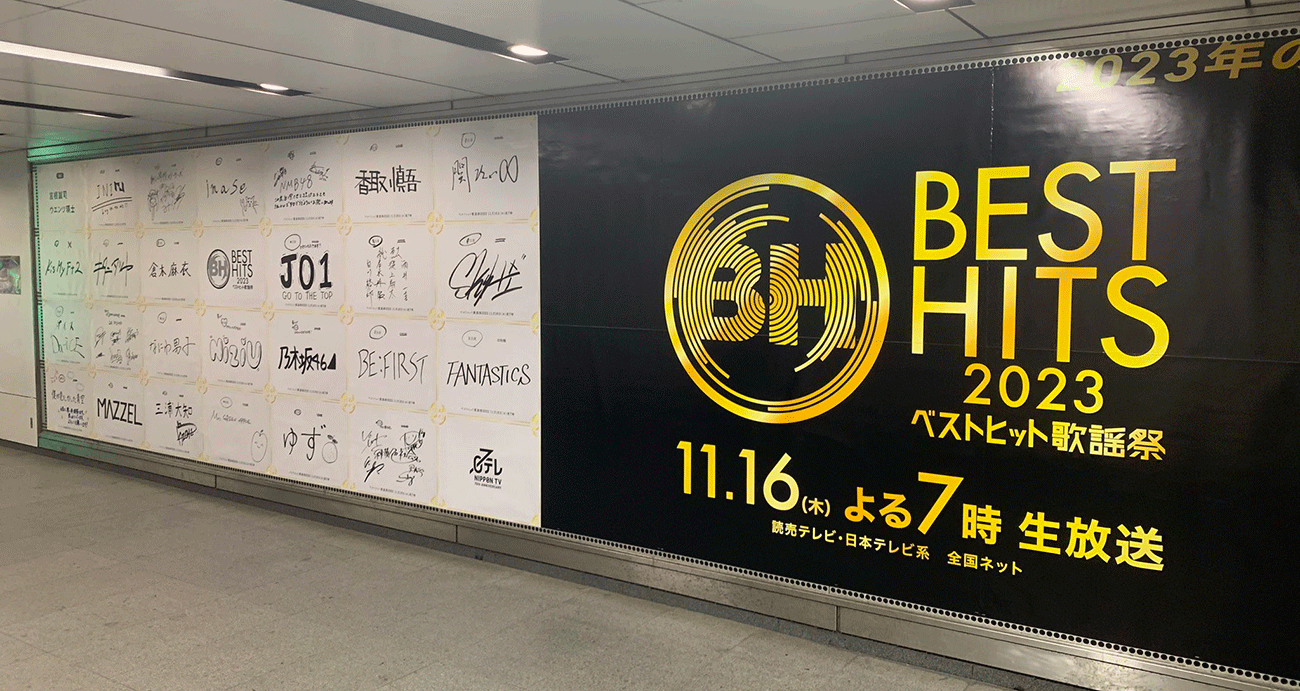 同様のクリエイティブは都内中心に全国各地で見られ、数多くの憶測投稿が見られましたが、数日後に展開された広告で読売テレビの番組「ベストヒット歌謡祭2023」への招待状であったことが明かされました。後から掲出された広告には、「出席・欠席」という項目があり、前回のポスター広告で招待されていたアーティストがそれぞれ可否を記載。手書きの回答がそのまま掲載されていました。