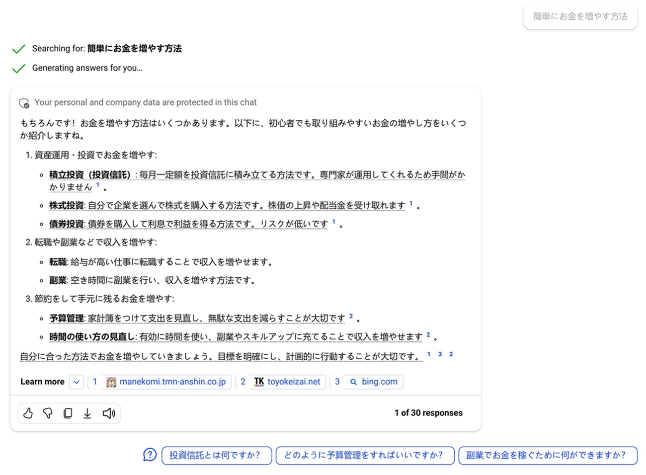 検索する頻度が激減した代わりに、チャットする頻度が激増している。その理由は、Bing Chat Copilotがフィルターの役割を果たし、悪質なSEOサイトを結果的に排除するからだ。たとえば、「簡単にお金を増やす方法」とチャットした場合、通常の検索エンジンならSEOスパムのページが検索結果に表示されやすいクエリなのだが、Bing Chat Copilotなら、以下のような回答を返してくる。