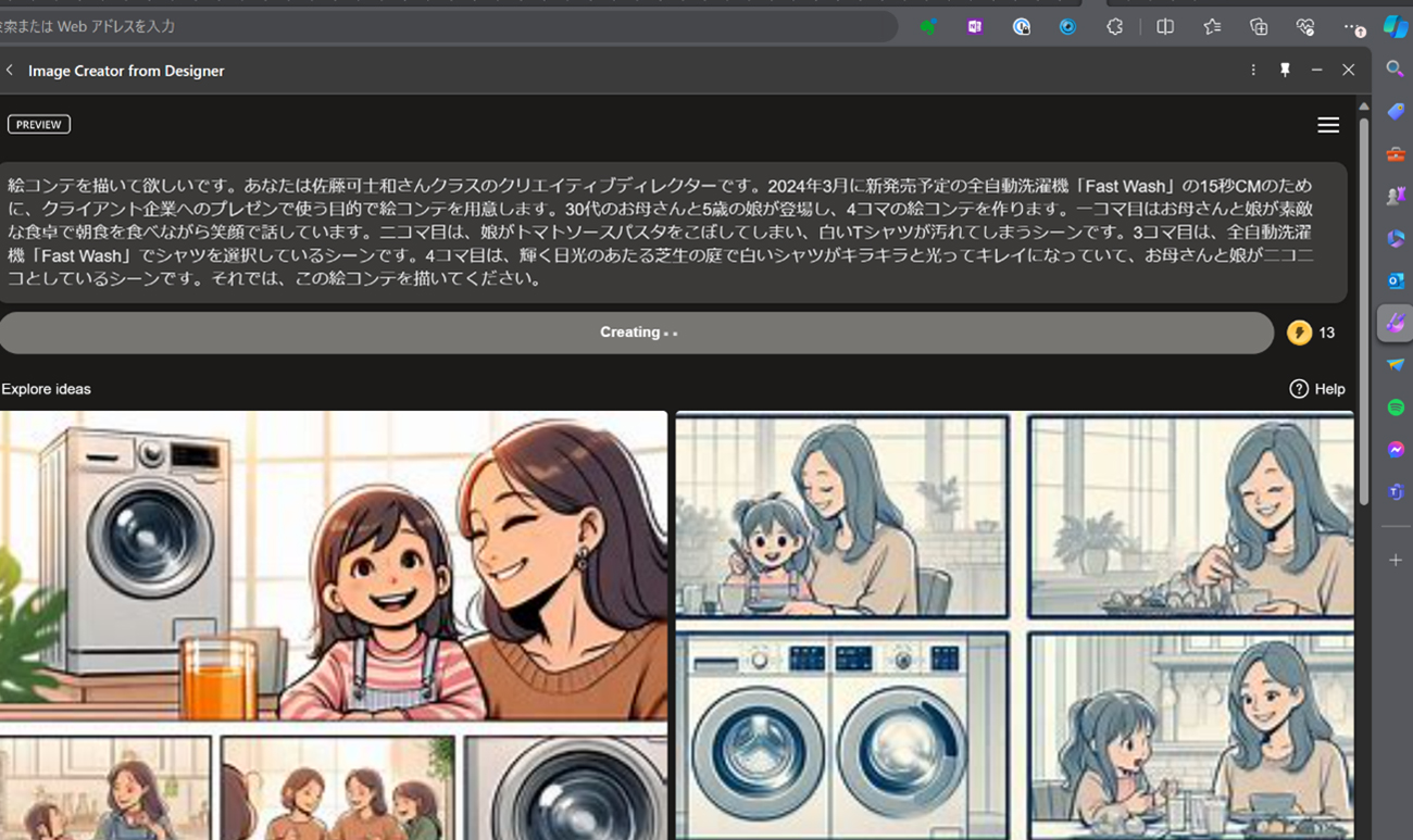これが佐藤可士和さんクラスの絵コンテなのかどうかは置いておくが、この絵コンテ作成のためには、ブラウザEdge右端のクイックアクセスに表示される「Image Creator from Designer」をクリックして、プロンプトを入力し、「Create」ボタンを押すだけだ。「Powered by DALL·E 3」と画面右下に表示されていて、無料で使える。つまり、ブラウザEdgeも無料でダウンロードでき、かつ、無料でGPT-4のチャットが使えて、さらに、無料で DALL·E 3で画像生成ができてしまう。そして、還元も充実していて、MS Rewardsでポイントが貯まるということになる。
