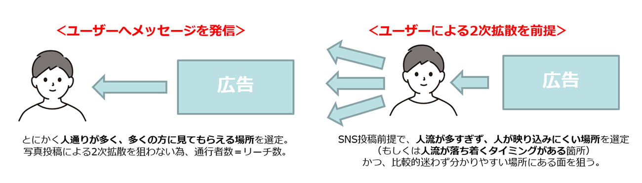 一つ目が、「OOH自体が熱源となることで拡散を広げている」点です。私自身、OOHの戦略パターンは「ユーザーへのメッセージを発信するもの」と「ユーザーによる二次拡散を前提とするもの」の2通りだと考えています。