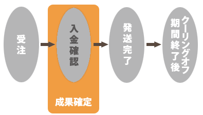 成果確定のタイミングはECサイトによってさまざまです。たとえば、商品の購入では「受注時」「発送完了時」「クーリングオフ期間後」「入金確認時」などが考えられます。一般的には、「発送完了時」としているところが多いようです。資料請求や会員登録では、申し込みの重複などがないかどうか、また、コミッションを得る目的で不正に複数の資料を請求したり、架空の人物で会員登録をしたりしていないかなどを確認した後、確定としているケースが多いでしょう。