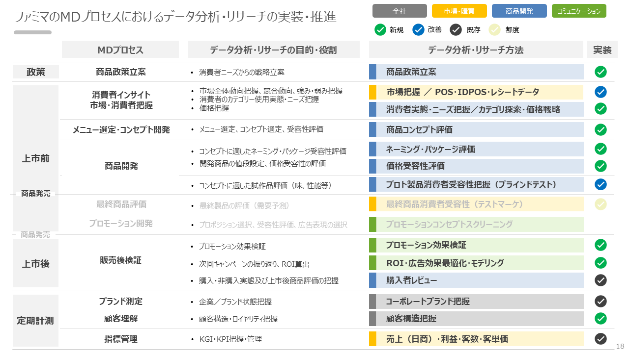 ファミリーマートでは下図の通り、MDプロセスにおける商品政策から上市後の販売後検証までの各段階、そして定期的なブランドの状態把握、ロイヤルティの計測などでそれぞれデータ分析・リサーチを実施しているという。そのうちプロモーションの段階についてはマーケティングを主体とした独自性のあるコミュニケーション設計を行うため、あえて調査を行っていないのも特長の一つだ。