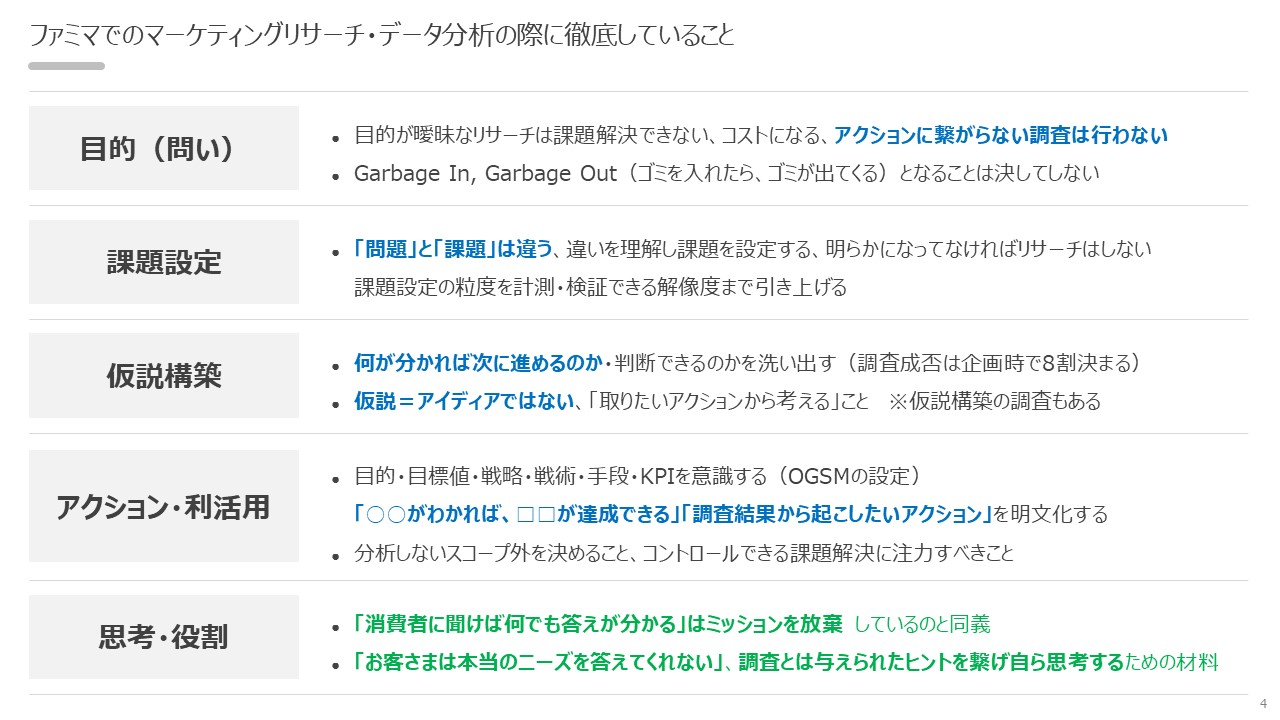 さらに出下氏は、マーケティングリサーチ不要論者の多くは、上図の目的~アクション・利活用のポイントが明確にできていないことに加え、「思考・役割」の部分で大きな誤解をしていると続けた。