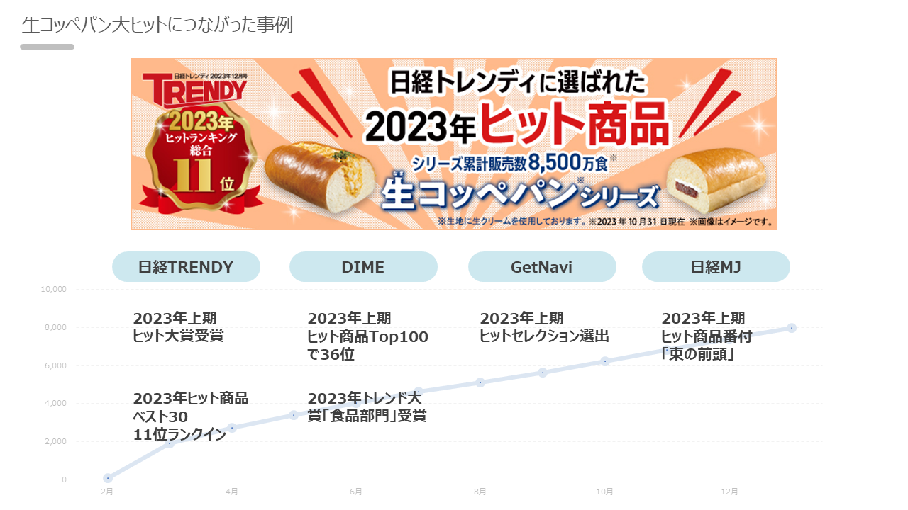 生コッペパンの開発は、従来のコッペパンに消費者が何らかのペインを抱えているのではないかという問題提起からスタート。「ボソボソ、パサパサ」という食感のマイナスイメージに対し、ノスタルジックな世界観・素朴さはそのままに「もっちり生食感」という新しい価値なら解決できるという仮説を立てた。このアイデアの実現とともに、コミュニケーション施策が上手く嚙み合ったため、累計販売食数で1億2000万食(24年2月15日時点)を突破する大ヒット商品となり、定番化に成功したと出下氏は語る。