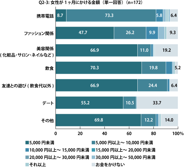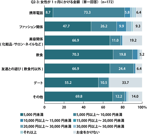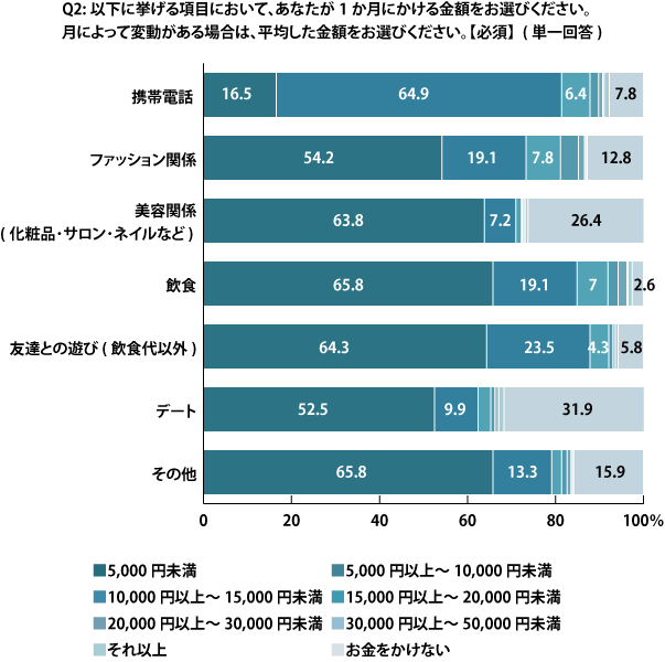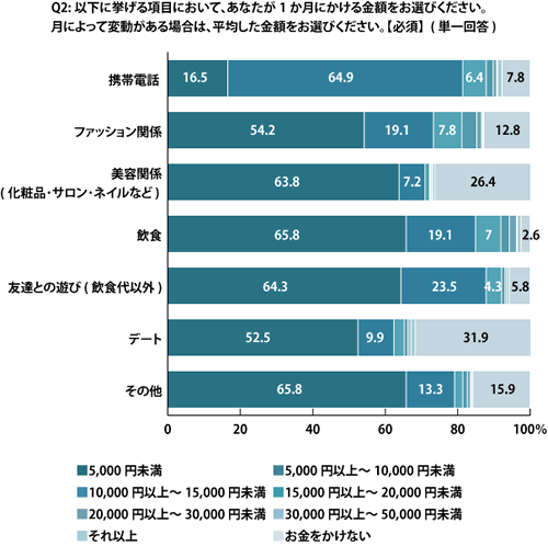 Q2では、1カ月にかける金額を携帯電話やファッション関係など全5項目について尋ねた。その結果、【携帯電話】においては「5,000円以上~10,000円未満」が64.9%で最も多く、次いで「5,000円未満」の16.5%が続く結果となった。この結果を男女別にみると、男性においては「5,000円以上~10,000円未満」が56.5%と全体に比べ約10ポイント減少し、逆に「5,000円未満」が約8ポイント増の24.3%となった。女性については、男性とは逆の傾向があり、「5,000円未満」が約8ポイント減少し8.7%、「5,000円以上~10,000円未満」は約9ポイント増の73.3%となった。