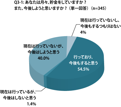 Q3では、貯金をしているかどうかと今後の利用意向を尋ねた。その結果、貯金を「行っており、今後もすると思う」と回答したユーザーは54.5%で半数を超えた。また、「現在は行っていないが、今後はしようと思う」は40.4%となり、10代男女の95%は貯金に対して積極的な意思を見せている。