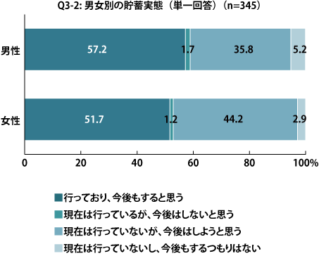 貯金の利用実態を男女別にみると、それほど大きな違いはないものの、男性は女性に比べ「行っており、今後もすると思う」と回答したユーザーが5ポイント以上高く、男性の方が貯金をしている傾向が強いことがわかった。今後の貯蓄意向については女性の44.2%が「現在は行っていないが、今後はしようと思う」と回答しているのに対し、男性は35.8%に留まっている。また、「現在は行っていないし、今後もするつもりはない」というユーザーも5.2%と多い傾向にある。
