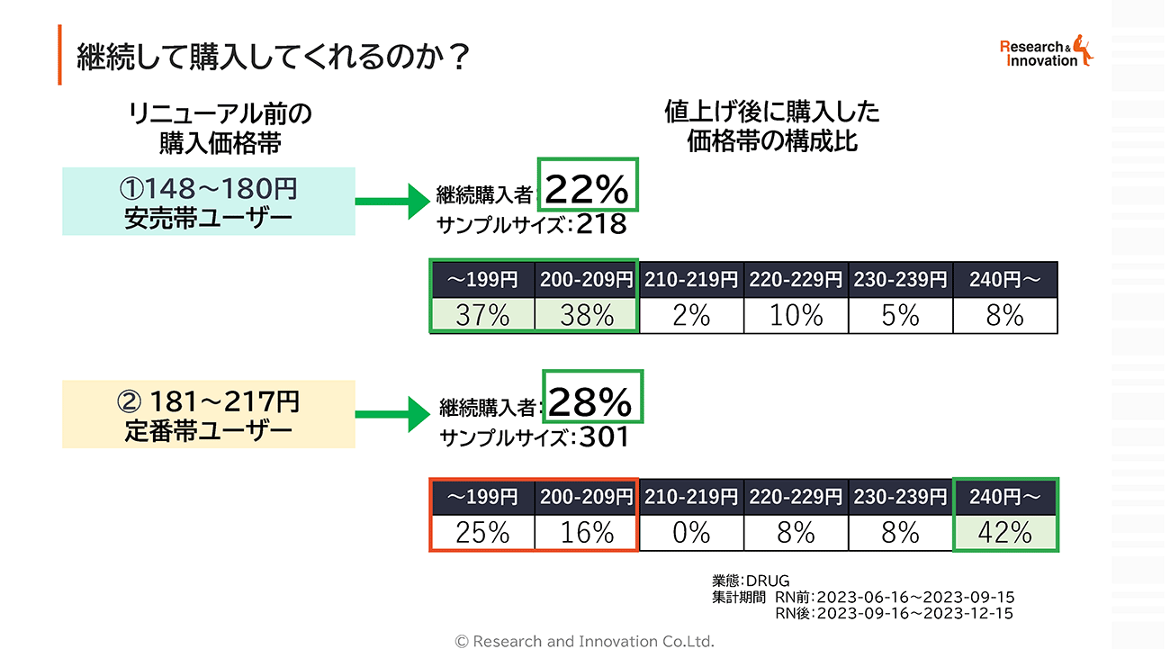 また、値上げ後に購入した商品価格帯の構成比は、安売り価格帯ユーザーは引き続き209円以下での購入が多かった。値上がり時に価格が安い他のブランドへスイッチするリスクを持つ層だと判断できる。定番価格帯ユーザーは、240円以上での購入構成比の割合が一番高い一方で、209円以下の安売り価格での購入比率も増えており、リニューアル前と比べて離反のリスクが高まっていることが見てとれる。