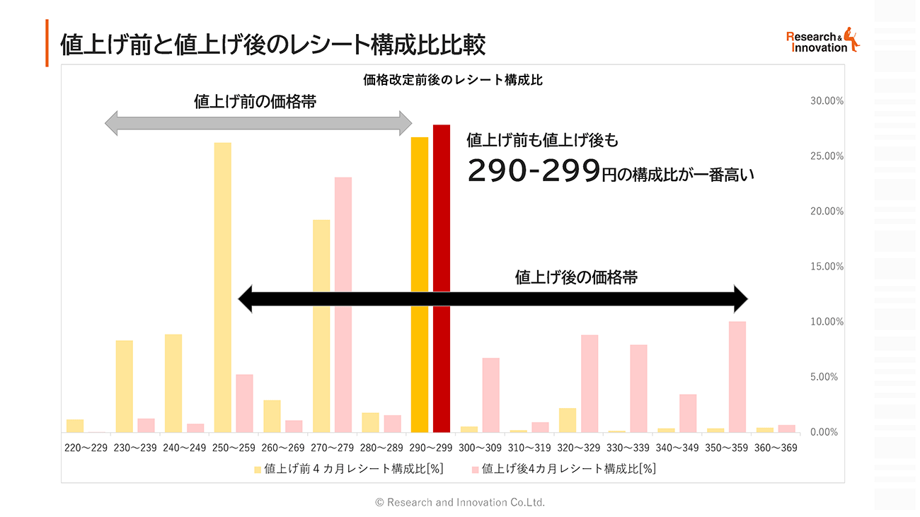 値上げ前後における価格帯ごとのレシートの構成比では、値上げの前も後も290円台での購入が一番多くなっている。