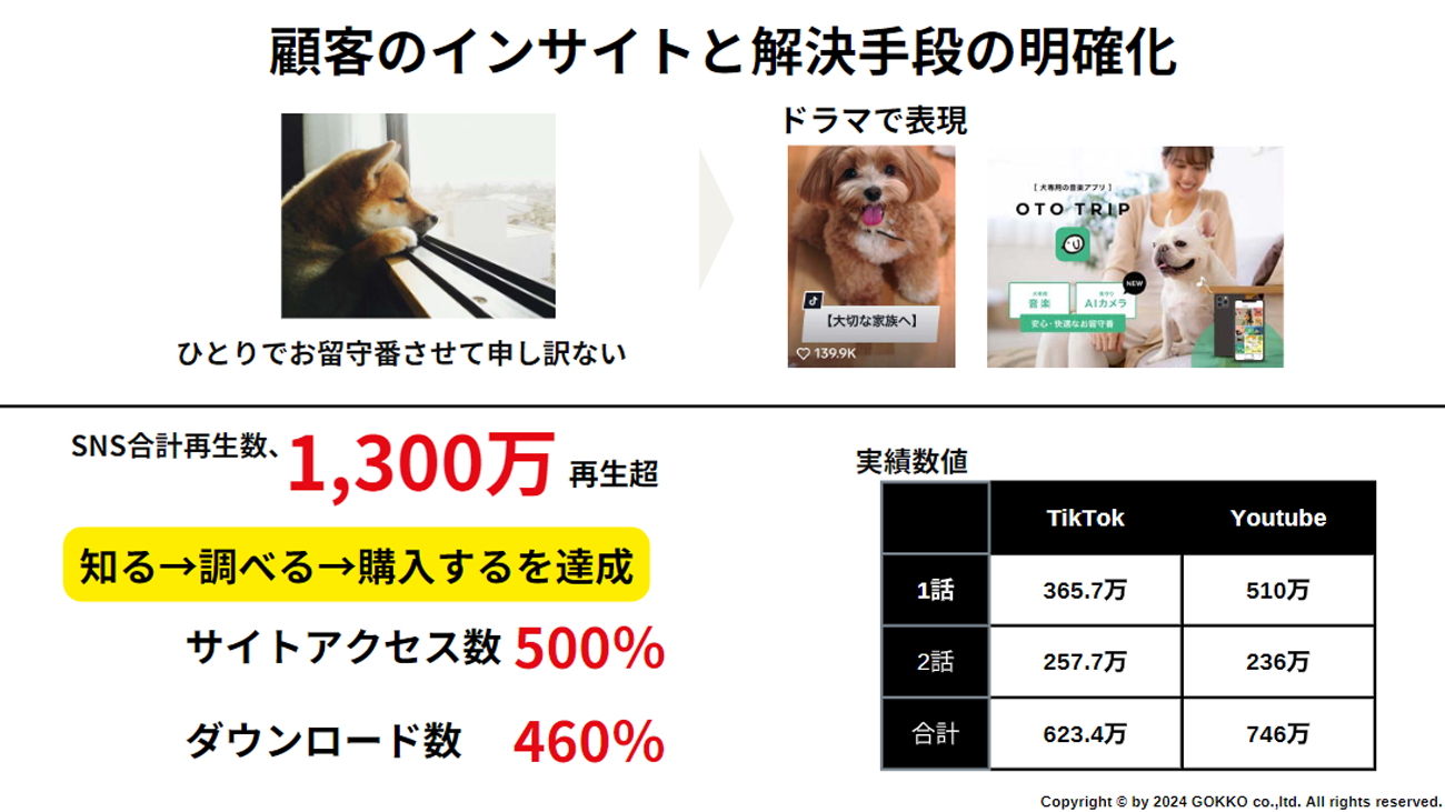 これが響き、SNS合計再生数は1,300万回、サイトへのアクセス数は500%となった。結果、知る→調べる→購入する(ダウンロード)という導線がうまく機能し、ダウンロード数は460%になった。
