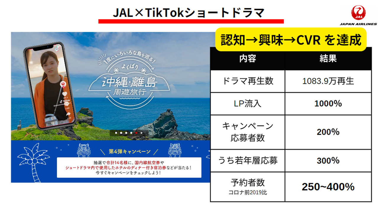 結果ショートドラマの再生数は、1,000万回を超え。すべてオーガニックで、広告は一切回いないという。LPへの流入数は、過去の同じ路線の施策と比較すると、10倍に。キャンペーン応募者数も200%となったことに加え、若年層の参加率が増加した。予約数は、コロナ以前の2019年と比較して250~400%増えた。