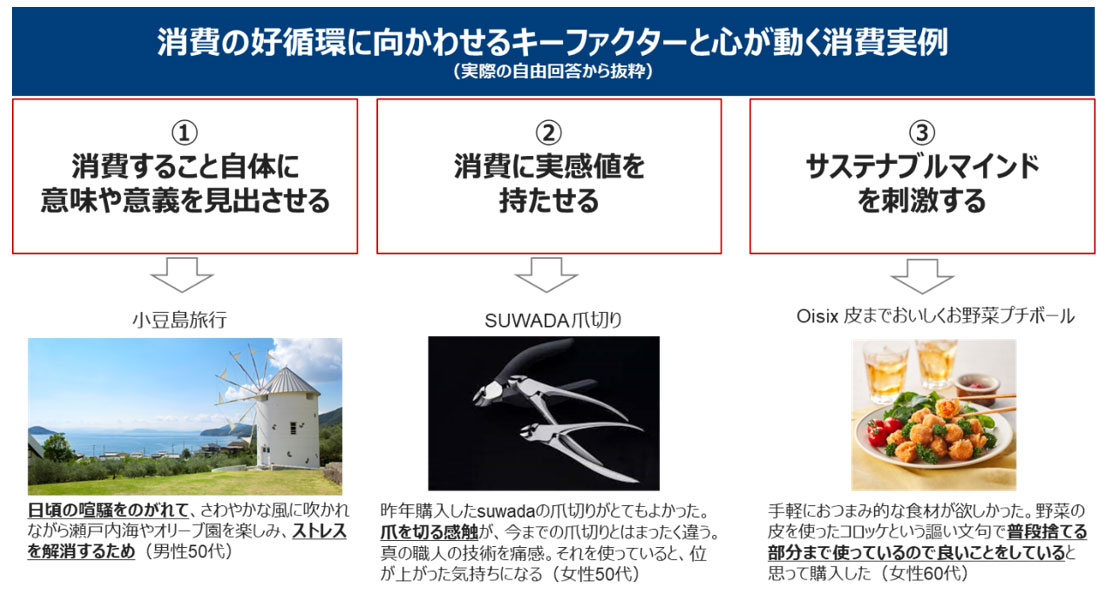 図版③は、『心が動く消費調査』の定量分析から見えてきた3つの好循環ファクターと、それに紐づく心が動いた消費の回答例です。先に結論を提示すると、消費者との関係性を作るには「単に消費するだけではなく消費に意味や意義を持たせること」「買い物をした後に実感値を得やすい商品特性を担保すること」「先行き不透明な世相だからこそ昨今重視されるサステナブルな志向を満たす仕掛けづくりを行うこと」という3つのポイントが大切であると推察できます。
