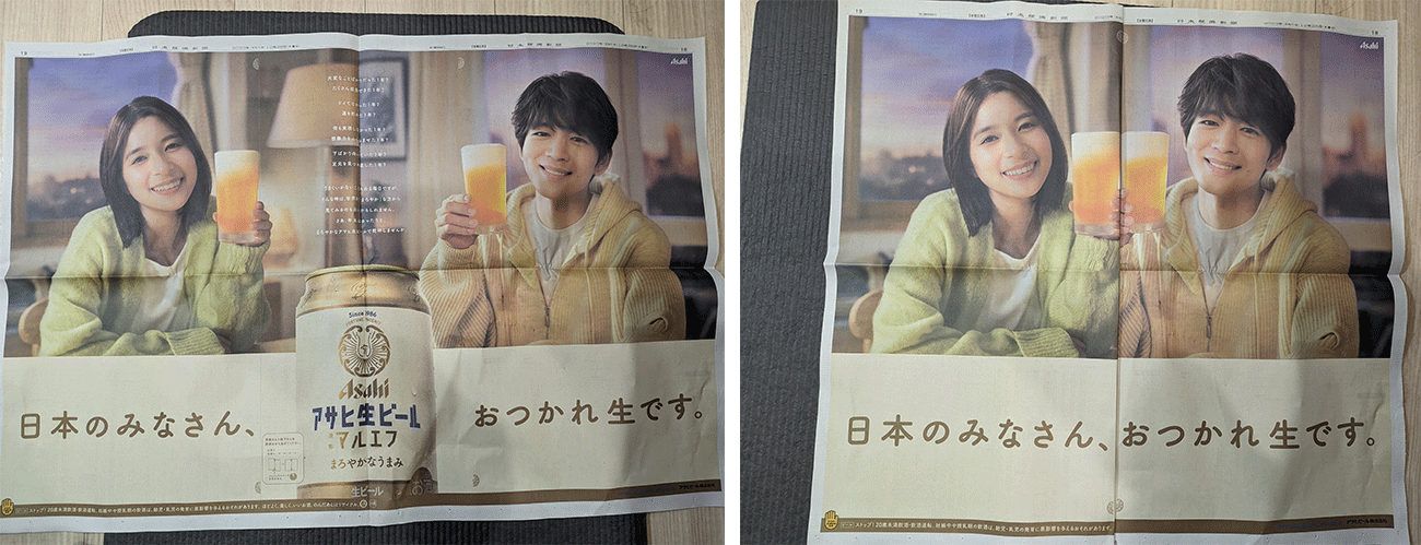 2023年12月に掲載された、アサヒ生ビールの広告では、新聞の特性をうまく活かした演出で話題になりました。年末のタイミングで実施された同広告は、折りたたむことでタレントが乾杯するビジュアルになるように設計されています。