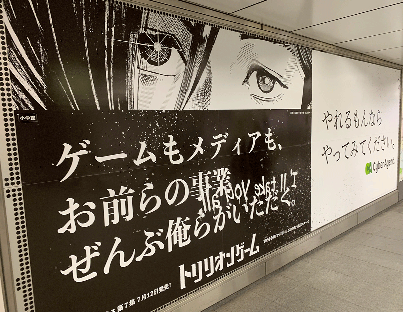 ストーリーにならって同広告では、サイバーエージェントに対して「ゲームもメディアも、お前らの事業ぜんぶ俺らがいただく。」と記載。それに対して、サイバーエージェントが「やれるもんならやってみてください。」という広告を横に掲出し、バトルを演出していました。漫画の世界を飛び越え、実在する企業とコラボした事例でした。