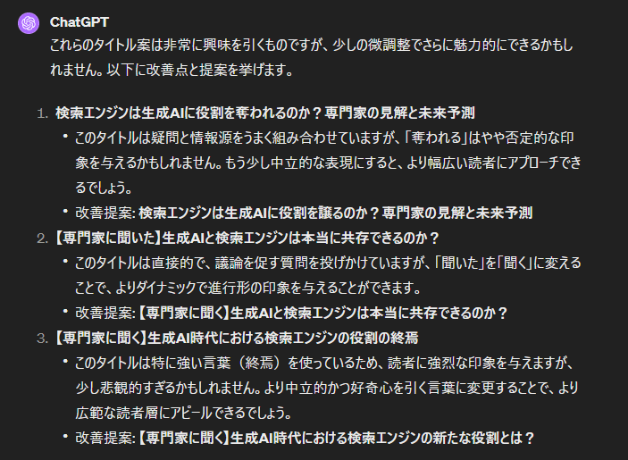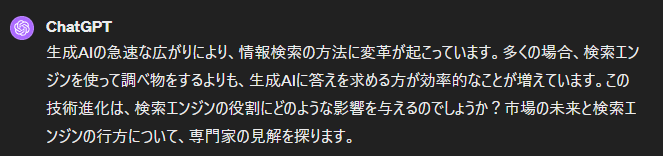 以降は『検索エンジンは生成AIに役割を奪われるのか?専門家の見解と未来予測』を完成したタイトルとして扱います。