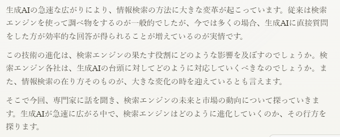では、『検索エンジンは生成AIに役割を奪われるのか?専門家の見解と未来予測』のリード文を作ってみましょう。