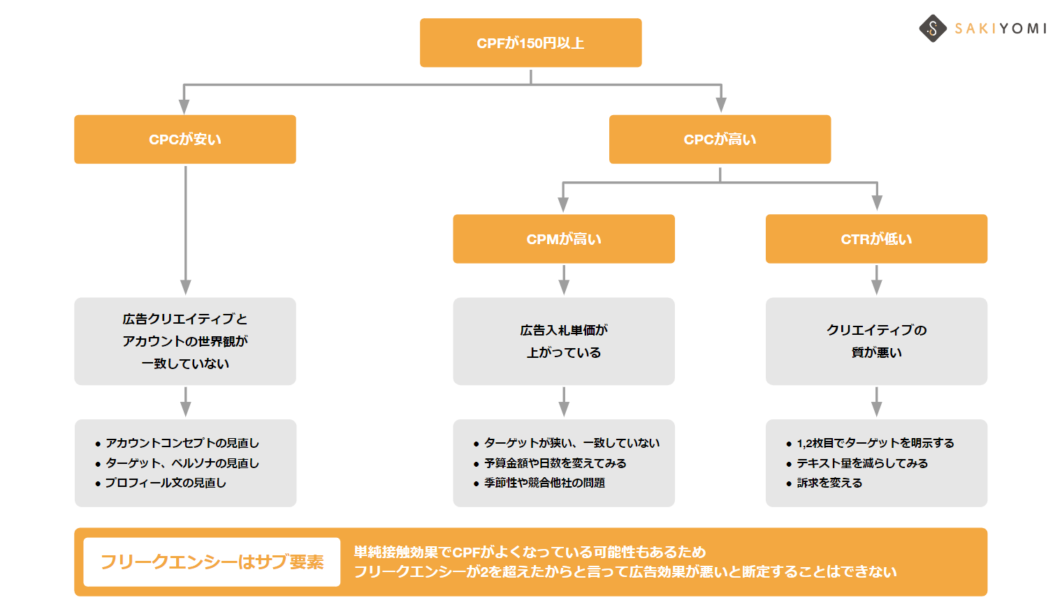 広告を実施してCPFが150円以上だった場合、以下のチャートを参考に改善案を考えます。