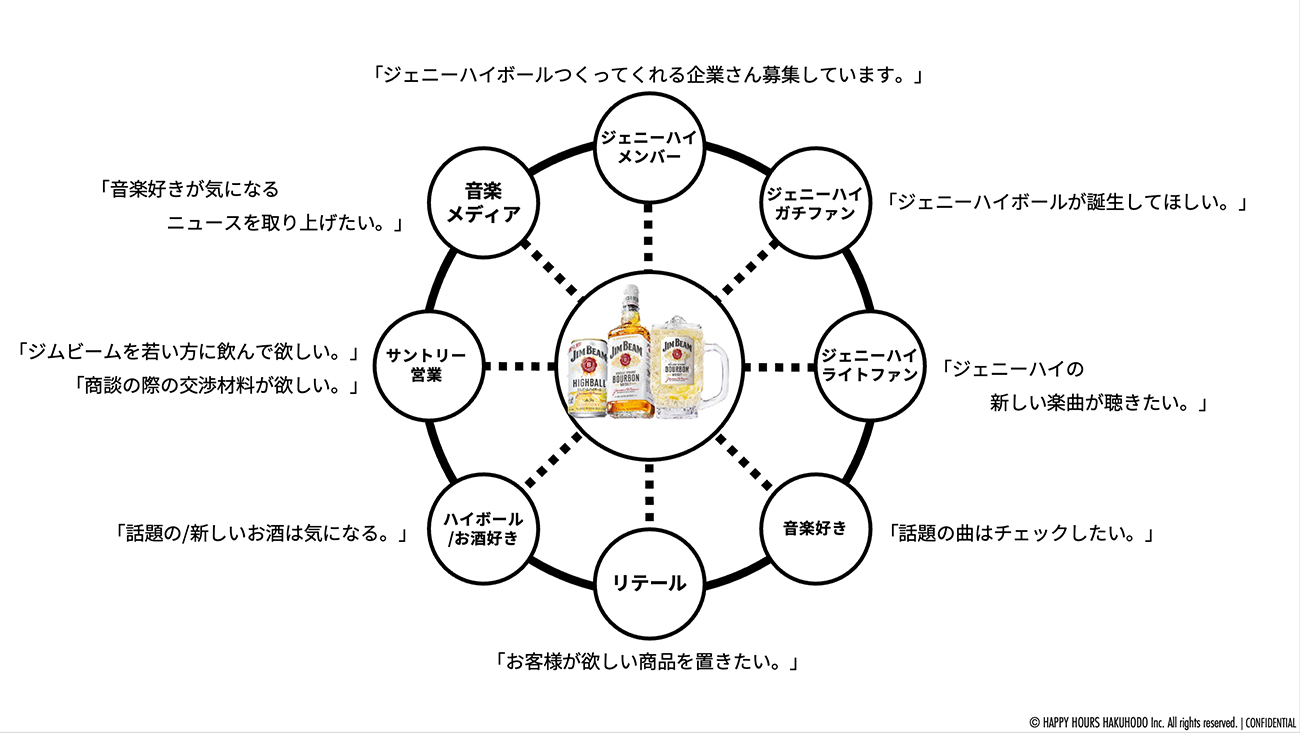 そこで、ジムビームとジェニーハイのコラボプロモーションを考え、「日清のどん兵衛」のときと同様に、石口氏はステークホルダーの洗い出しを行った。
