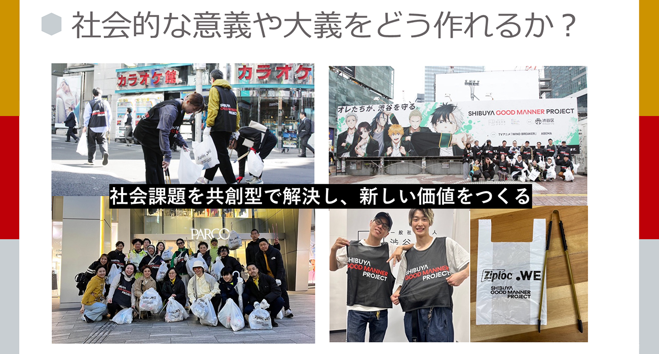 そしてコロナ禍による人々の価値観の変化を経て、新たな視点が生まれている。それが社会課題を共創型で解決し、新しい価値を作ることだ。たとえば渋谷センター街のゴミ拾い活動の場合、個人も企業も「渋谷のゴミをゼロにする」という共通のミッションを掲げて活動している。