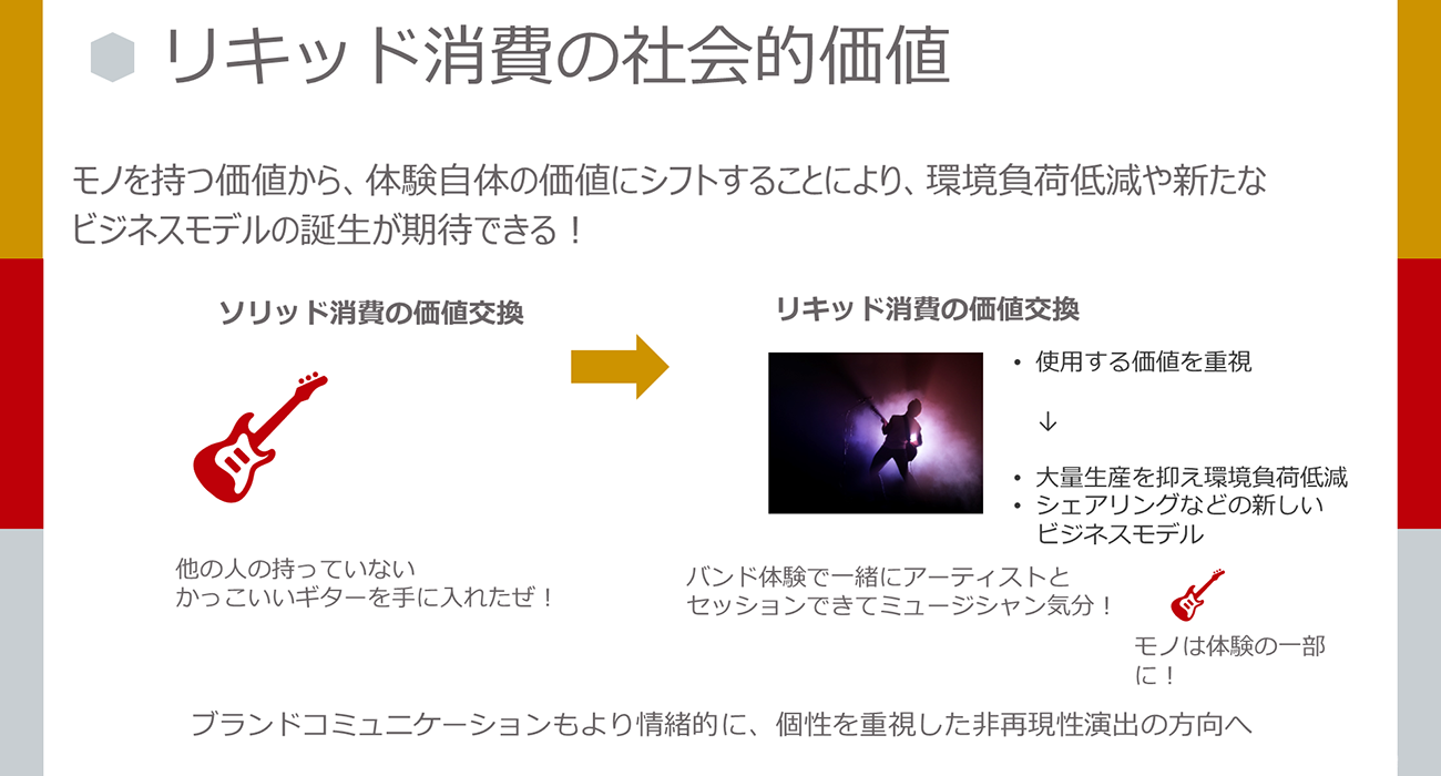 一方で体験を重視するリキッド消費では、購買後の使用価値に重点が置かれる。「かっこいいギターを所有していること」は体験の一部に過ぎない。購入したギターを使ってアーティストと一緒に楽しめるバンド体験など、その人・その場でしかできないことが重視されるようになるのだ。このことから、企業は「商品を渡すまで」ではなく、その後のLTV向上に力を入れる必要があるだろう。