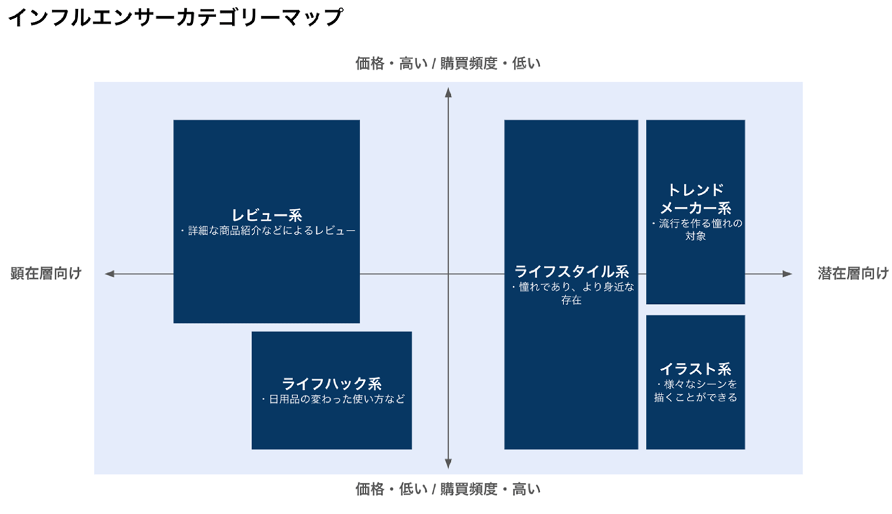具体的には、高額商品の場合、詳細な商品紹介や比較分析を提供するレビュー系インフルエンサーの起用が効果的です。なぜなら、消費者は品質や機能に基づいて慎重に選択を行う傾向があるためです。特に顕在客に対しては、購買前の比較検討をサポートするようなレビュー系インフルエンサーの専門的な見解が重要な役割を果たします。