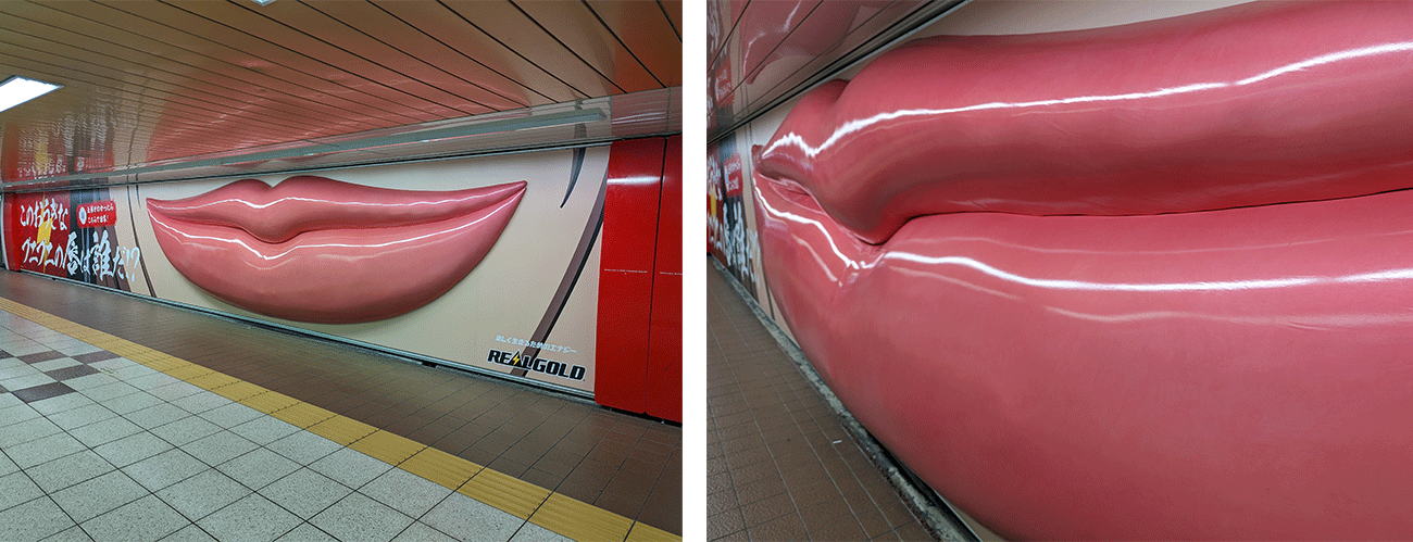 同広告で特筆すべき点は、大きな唇。私も現地で実際に見ましたが、光沢感が妙にリアルさを出しつつも、実際に触ってみるとプニプニしており非常に不思議な感触でした。