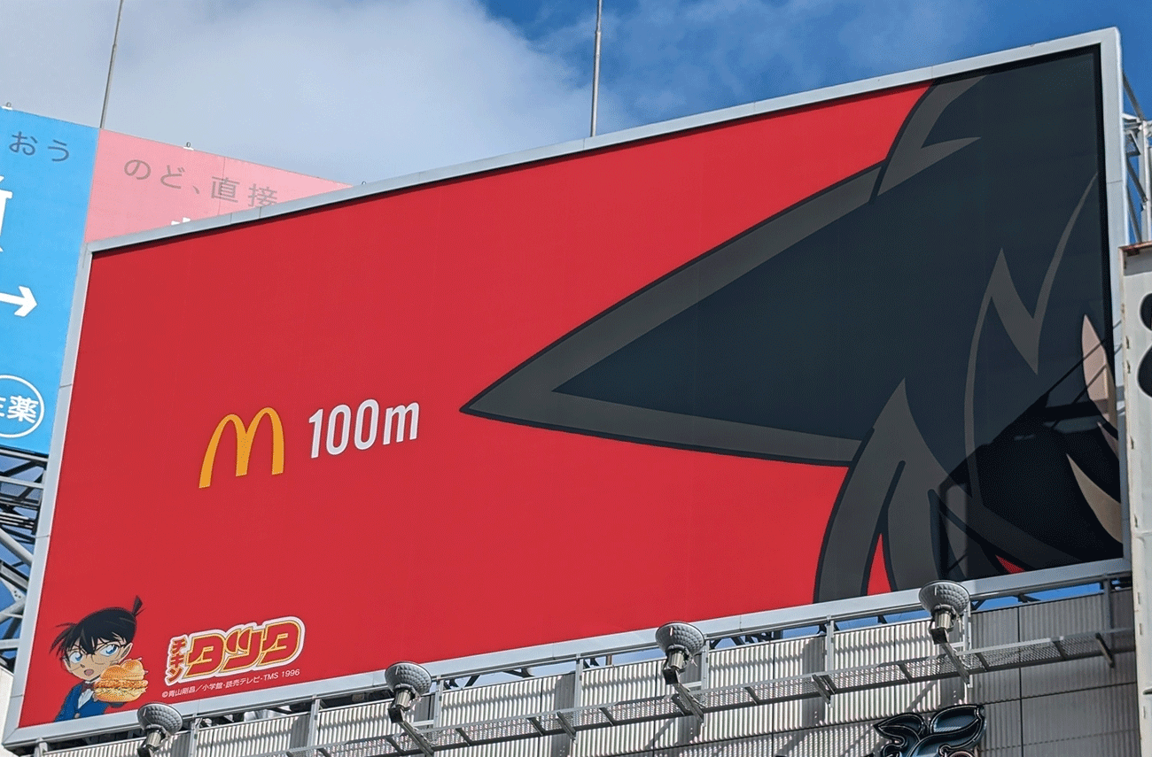 同広告では、名探偵コナンのキャラクター、毛利蘭の特徴的なヘアスタイルを矢印に見立て、マクドナルド店舗の方向を指し示してします。このデザインは、鮮やかな赤色と相まって強烈な視覚効果を生み出しSNSで話題になりました。キャラクターが持つ特徴を予想外な形で活かしたおもしろい広告です。