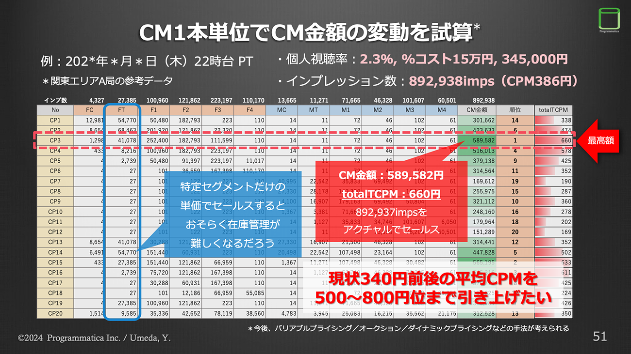 ただし、一つの視聴データだけですべてのインプレッション取引を行う場合はこのtotalTCPMで見ても、単純にCM金額だけで見ても、テレビ局にとって一番収入が高まる選択肢は変わりません。