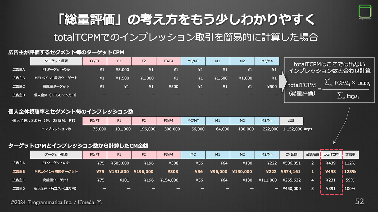結果は、広告主Bがもっとも高い金額(574,161円)/totalTCPM(498円)となり、MF1層+MF2層に効率的となるこのCM枠は広告主Bに割り当てられます。ここで重要なことは、広告主Bは単に一番高くCM枠を買うということではなく、総量評価のインプレッション取引においては広告主BにとってもこのCM枠がよりターゲット効率が高くなっているということです。それは次回以降でご説明します。