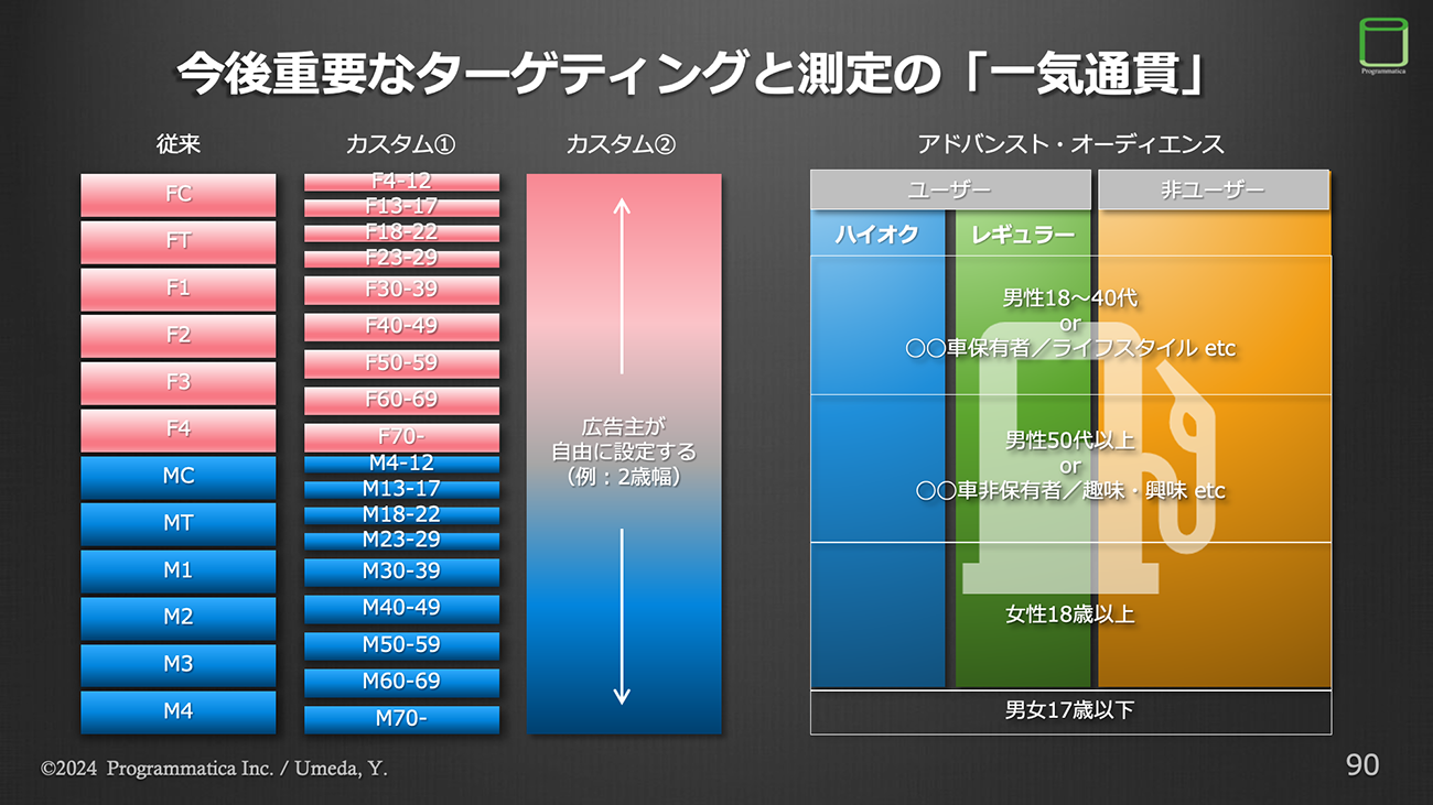マルチカレンシーになれば、デモグラにおいても従来の12区分から若者層をもっと細かく区分するとか、あるいは広告主が年齢区分を自由に決めてカスタムセグメントでバイイングすることが可能になります。