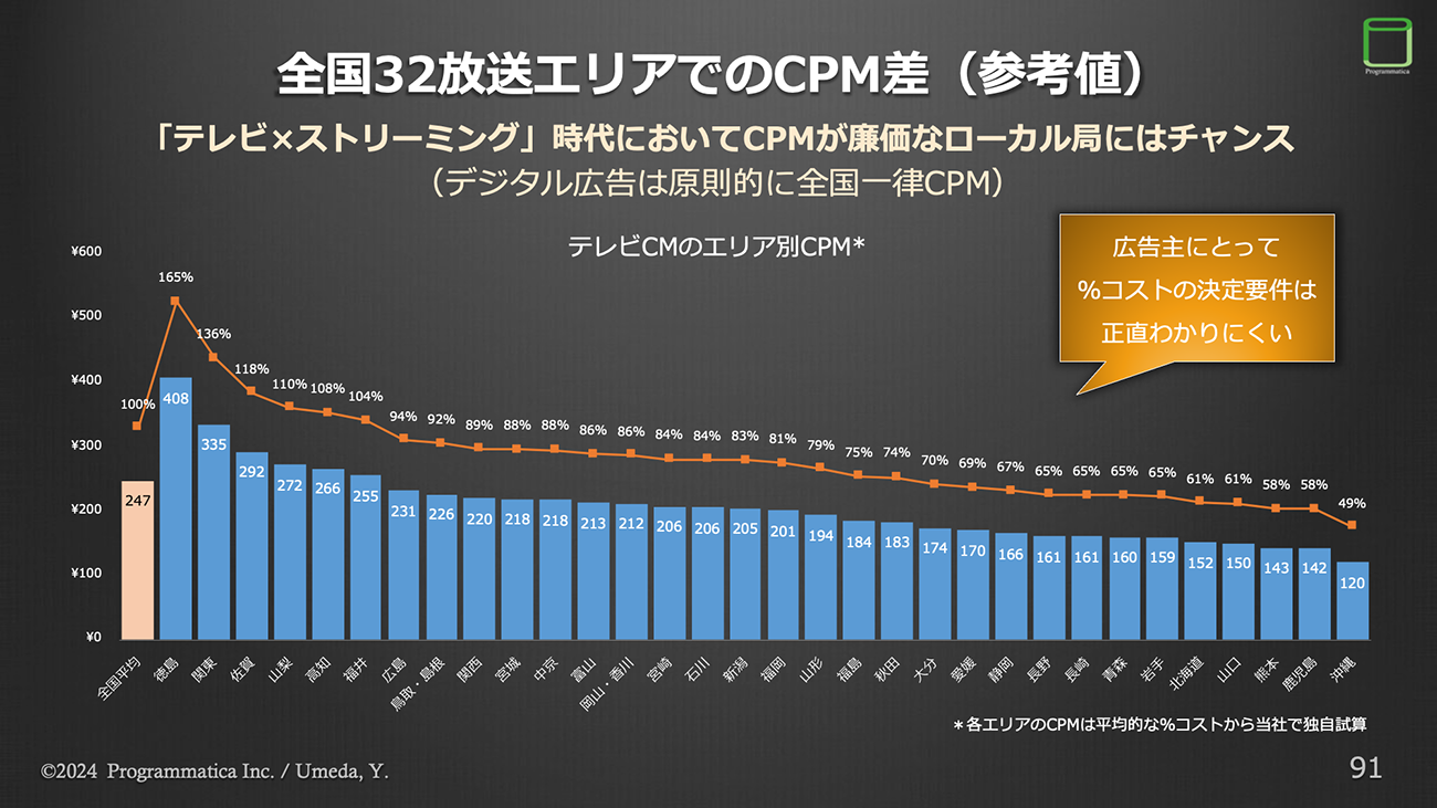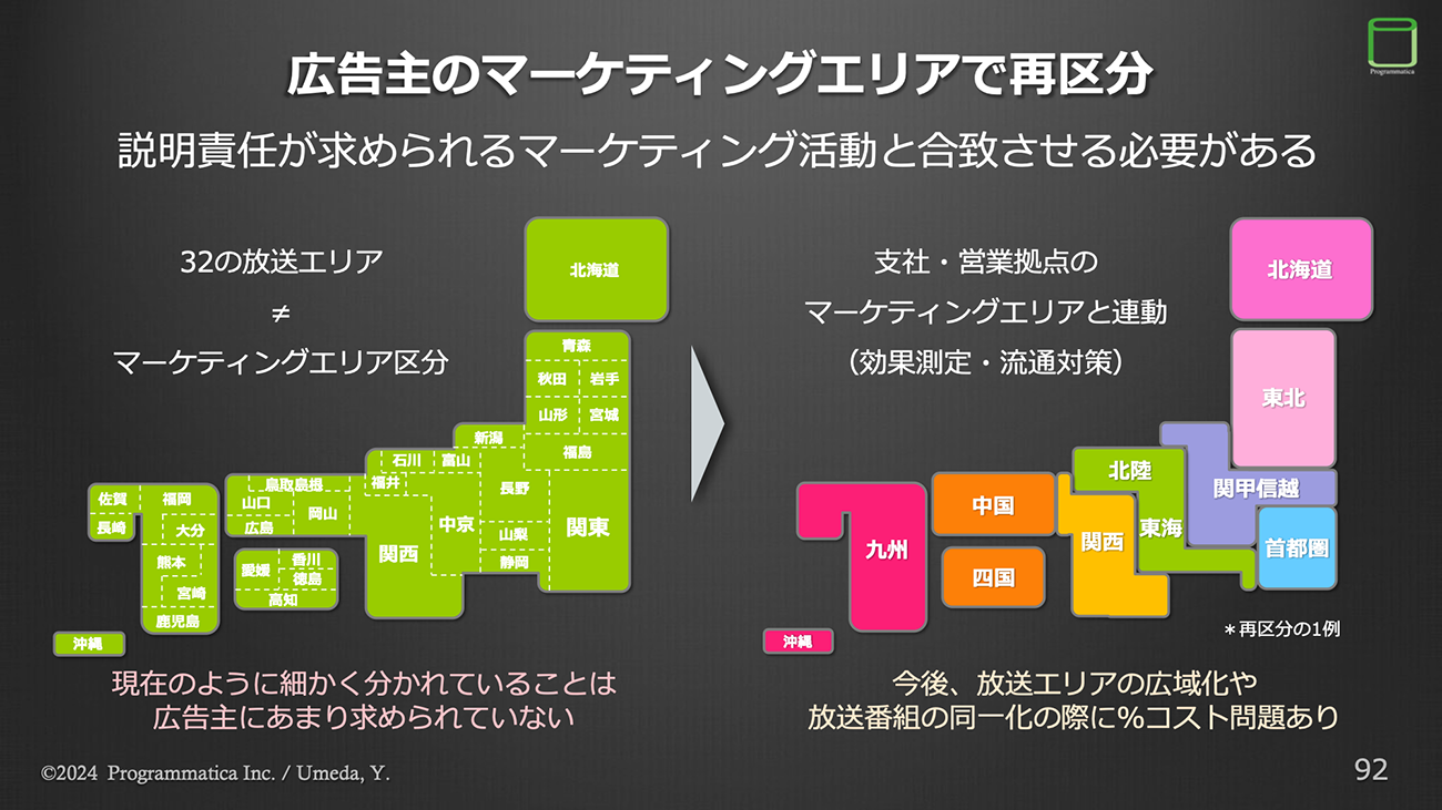 さらに各種事情で、放送エリアの広域化や放送番組の同一化などの話が近年ありますが、そのためには、たとえば九州・沖縄エリアをひとつとした際のテレビCMの適正価格はいくらか? を整理する必要があります。