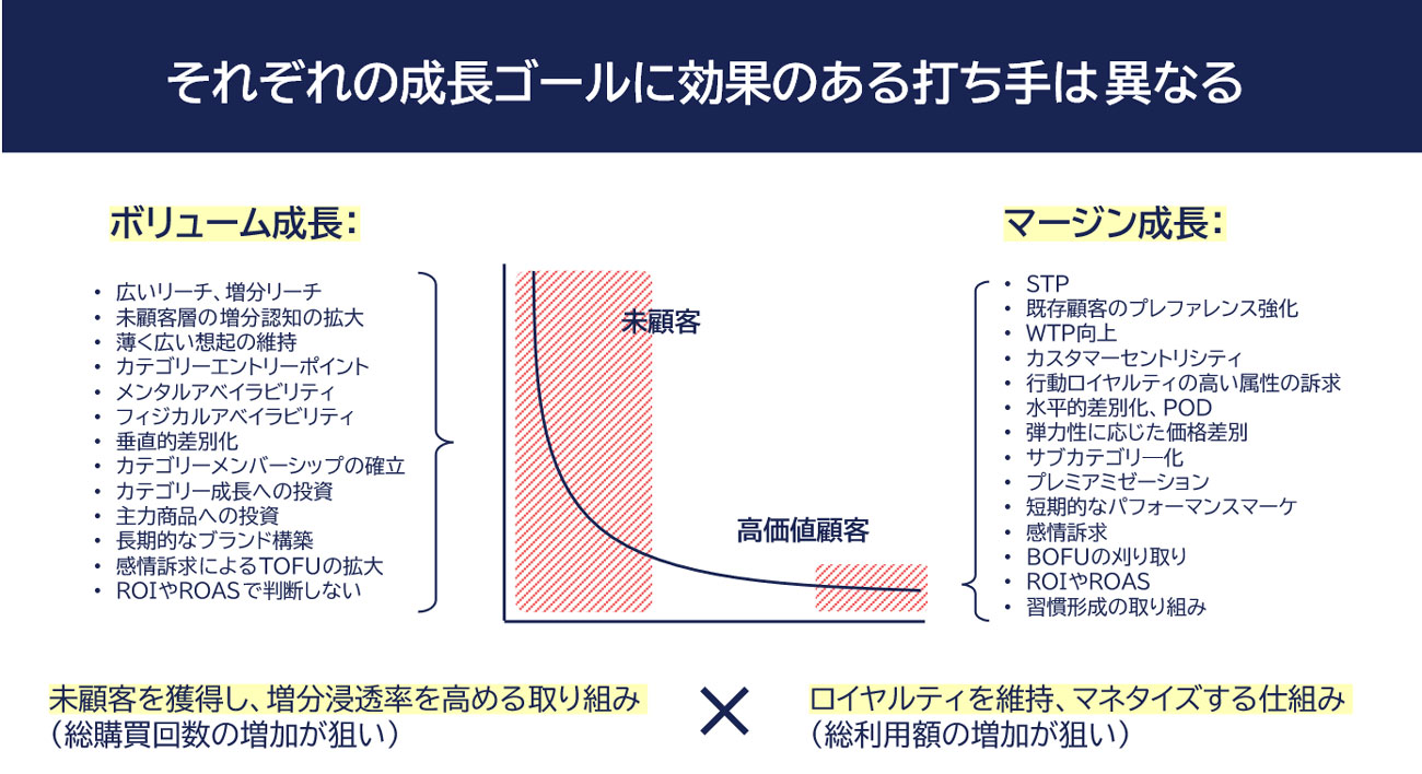 負の二項分布の左側、つまり未顧客やライトユーザーに着目し、購買回数や浸透率の増加を目指すアプローチを、私は「ボリューム戦略」と呼んでいます。それに対して分布の右側、一部の高価値顧客に着目し、利用額や利益率の増加を目指すアプローチを「マージン戦略」と呼びます。