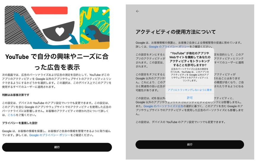 「次の画面では、広告のパーソナライズおよび広告の測定を目的として、YouTubeがこのアプリのアクティビティをGoogle以外のアプリやウェブサイトのアクティビティとリンクできるようにするかどうかを選択します」と記載されていて、その後に、ズバリ、「判断はお客様次第です」とボールドで表記されている。
