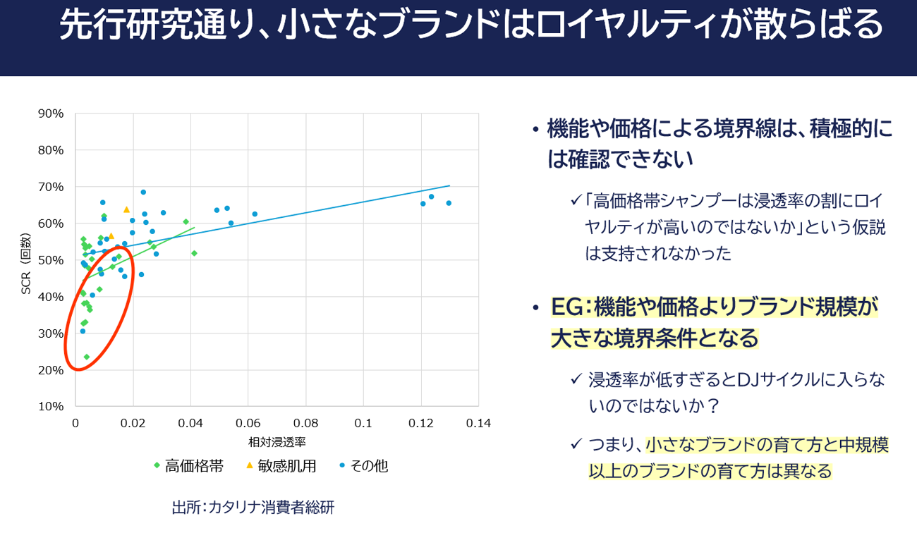 ・再現研究:日本のシャンプーカテゴリーでは、機能や価格よりブランドサイズが大きな境界条件になる。つまり浸透率が低すぎると、「アベイラビリティが高まるほど行動ロイヤルティも高まる」というDJサイクルに入らない可能性がある