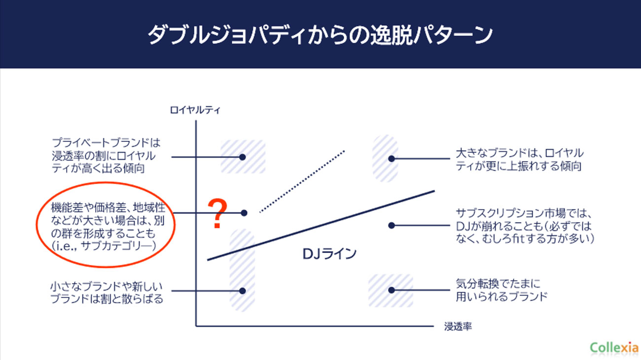 一方、浸透率の低いブランドはロイヤルティの散らばりが大きいことも見て取れます。シャンプーカテゴリーにおいては、実は機能や価格よりも、ブランドサイズが1つ大きな境界条件になるのかもしれません。つまり、浸透率が低すぎると、「アベイラビリティが高まるほど行動ロイヤルティも高まる」というDJサイクルに入らないのではないかと考えられます。