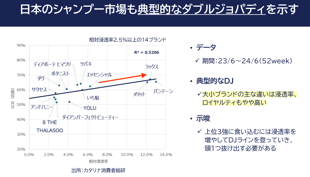 とはいえまずは、「日本市場にもダブルジョパディは当てはまるのか」という前提の確認から始めましょう。次の図は、カタリナ消費者総研の大規模ID-POSデータを基に作成した、日本のシャンプー市場を表すDJラインです。期間定義は2023年6月~2024年6月の52週間、相対浸透率2.5%以上の14ブランドを表示しています。
