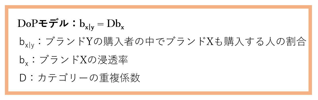 DoPテーブルを注意深く観察すると、任意の2ブランドは「相手先の浸透率」に従って顧客を共有していることもわかります。これは、数学的には次のDoPモデルで表されます(Ehrenberg et al., 2004)。