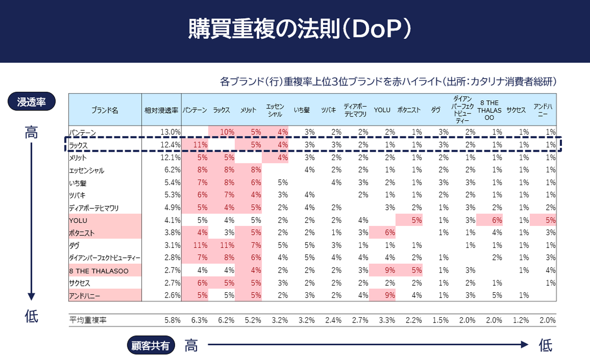 浸透率で考えればYOLUもパンテーンやラックスと最も競争になるはずです。しかし実際はそうなっていません。8 THE THALASSOにも同様の傾向があり、スペースの都合上載せていませんが他の高価格帯シャンプーにも見受けられます。こうしたDoPの例外はサブカテゴリ―を表していることがあります。たとえばシャンプーなら、これらはプレミアムヘアケアカテゴリーを表しているわけです。