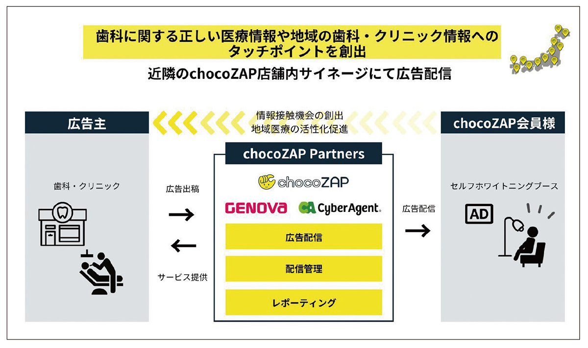 具体的には、RIZAPが運営するスマートライフジム「chocoZAP」の広告サービス「chocoZAP Partners(チョコザップパートナーズ)」において、3社が連携。chocoZAPのセルフホワイトニングブース内に設置したデジタルサイネージで、歯科やクリニックに関する情報を配信する。これにより、chocoZAP会員の口腔ケアに対する意識を高めるとともに、地域の歯科・クリニック情報への接触機会を創出し、地域医療の活性化につなげる。