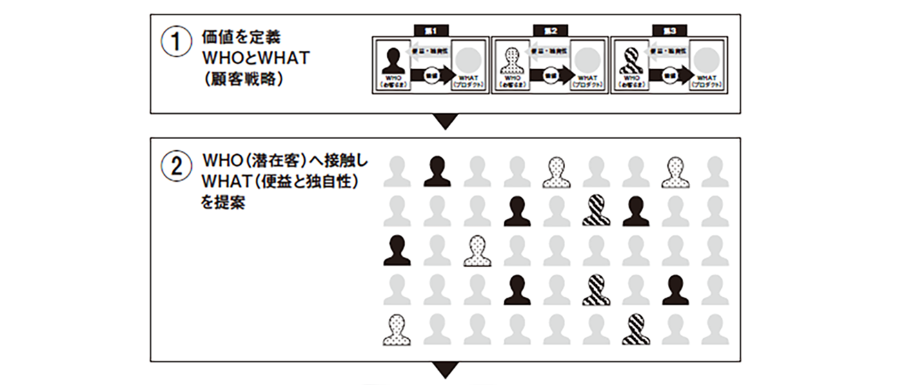 (2)WHO(潜在顧客)へ接触し、WHAT(便益と独自性)を提案
