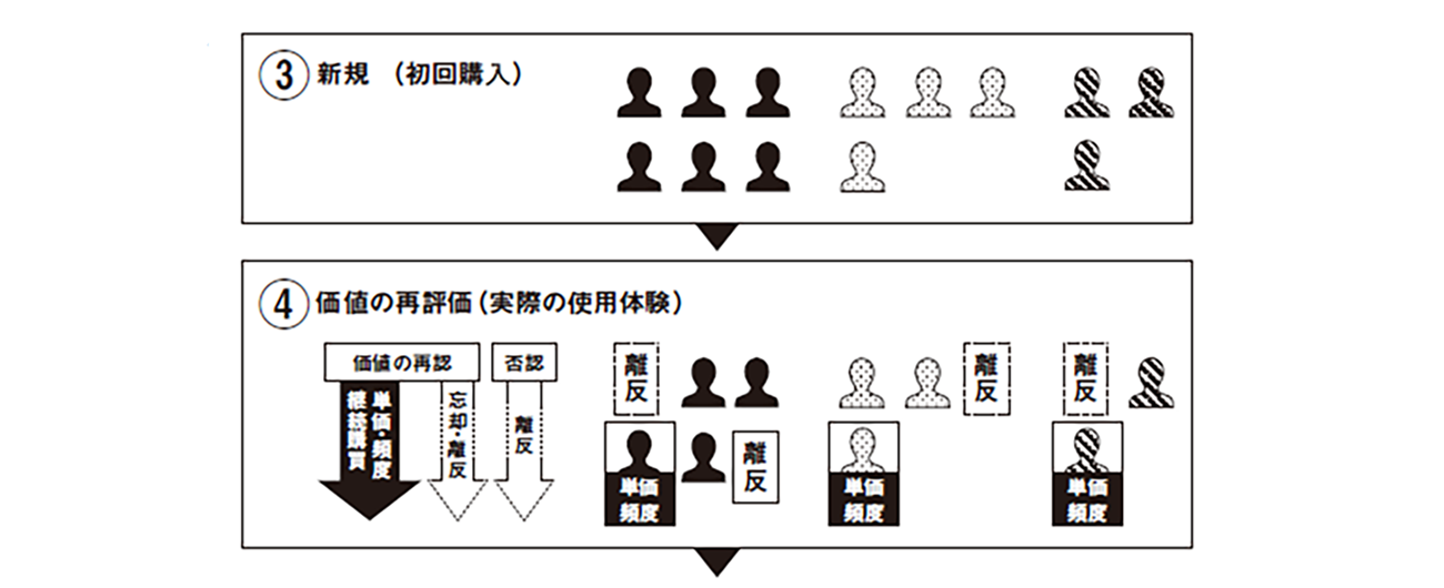 西口:「顧客戦略(WHOとWHAT)」が成立し、初回購入がされた後は、顧客は価値の再評価をします。入手したプロダクトを実際に使用してみて、期待通りであれば、あるいは期待とは違うけれど便益と独自性を実感したら、継続購入につながります。