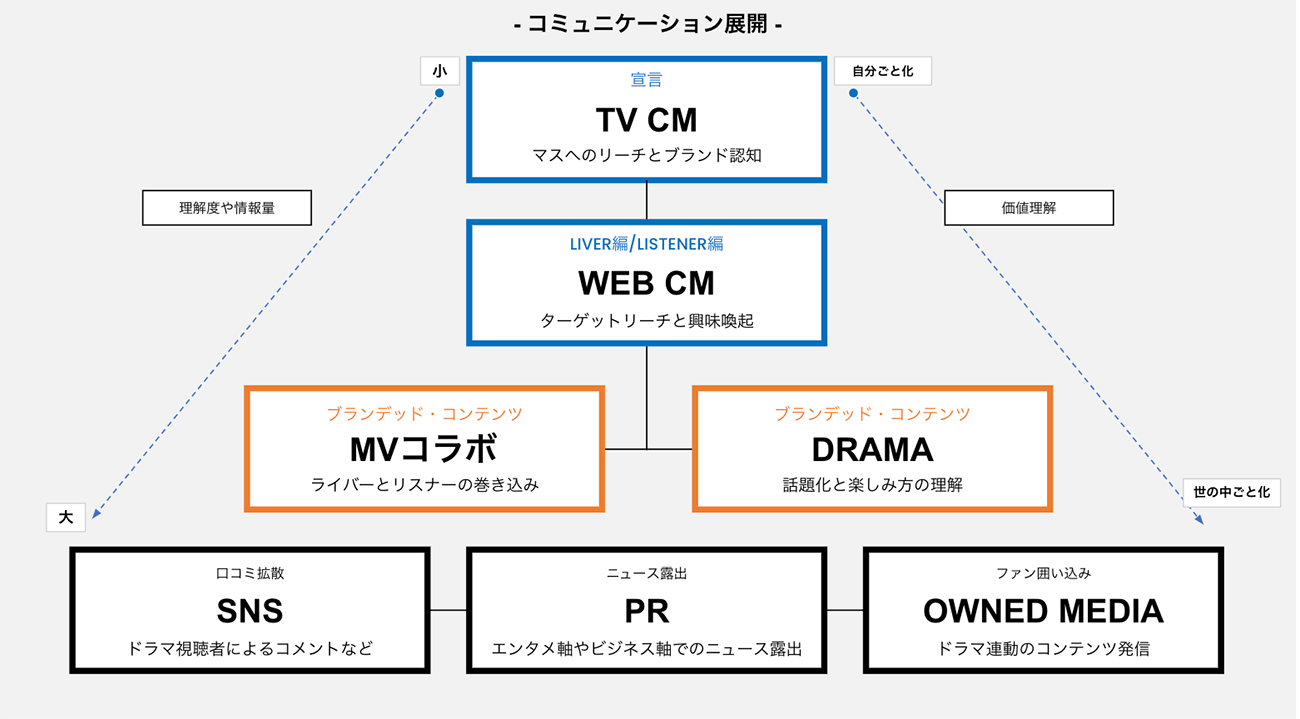 同社が次に紹介したのは、ユーザーに伝えるべき内容が定まった後に重要となる「どのように伝えるべきか(=How)」を策定する手法だ。同社はここでもユーザーアンケートのデータを活用し、その結果からロイヤルユーザーの中には通常のテレビCMをコンテンツのノイズに感じる視聴者が複数いると判明。コンテンツを楽しみながらPocochaを知れる手段が必要だとわかり、テレビ東京で放送されたドラマ「これから配信はじめます」や主題歌のMVの制作協力などに取り組んだ