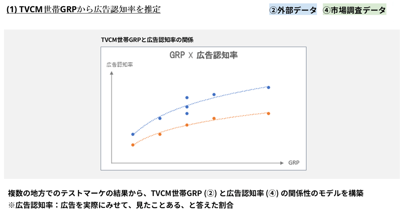 具体的には、まず複数の地方都市でテレビCMの放映と市場調査を実施。市場調査から得た各都市の広告認知率と、外部パートナーから得た各都市でのテレビCM世帯GRPを取得し、上図のようにプロットして、二つのデータの相関性を可視化する。タレントの出演有無によってグラフを分けることでそのアテンションの違いも加味しながら、テレビCMの投下量によって獲得できる認知量を推定できるようにするのだという。